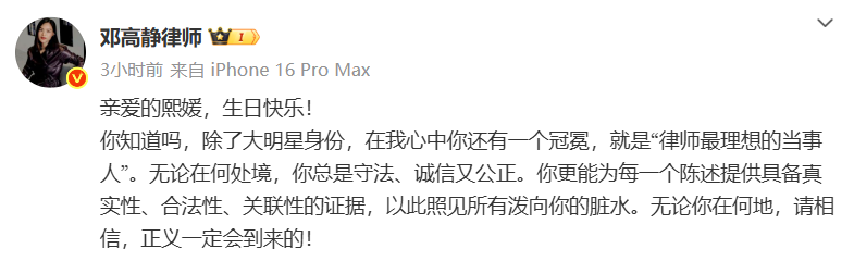 “亲爱的熙媛,生日快乐!你知道吗,除了大明星身份,在我心中你还有一个冠冕,就是‘律师最理想的当事人’。无论在何处境,你总是守法、诚信又公正。你更能为每一个陈述提供具备真实性、合法性、关联性的证据,以此照见所有泼向你的脏水。无论你在何地,请相信,正义一定会到来的!”