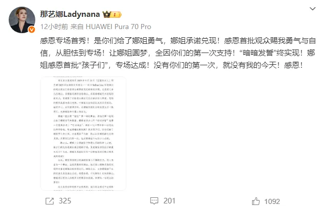 那艺娜表示,原定在重庆的演出只能延期,后续南宁、泸州、桂林等多场演出也将暂停,术后将按原计划赴英国巡演。