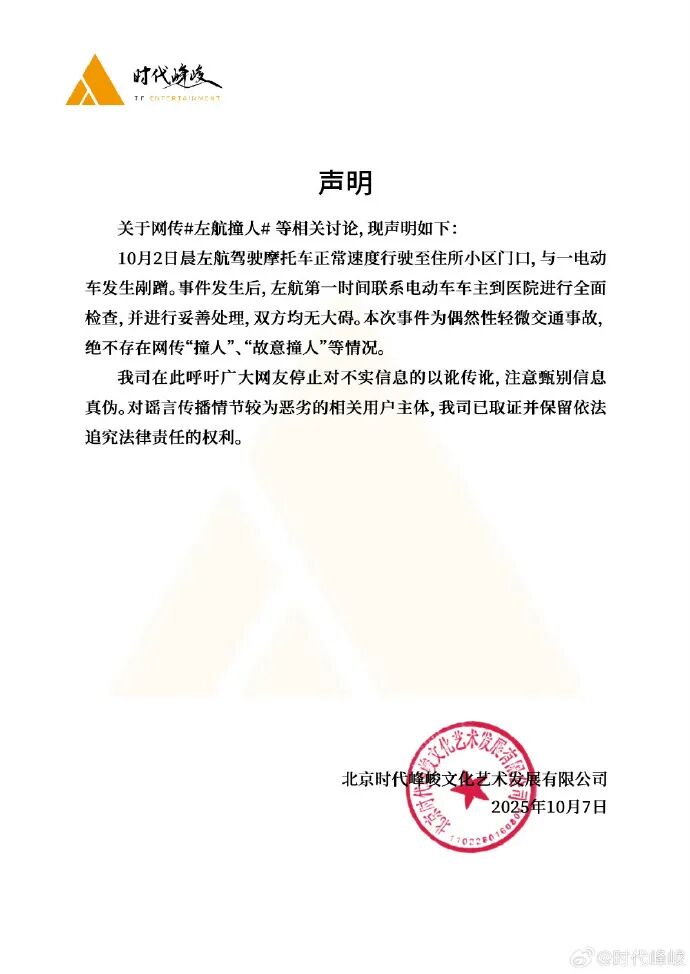 刚刚,时代峰峻发布声明,回应“网传#左航撞人#等相关讨论”。