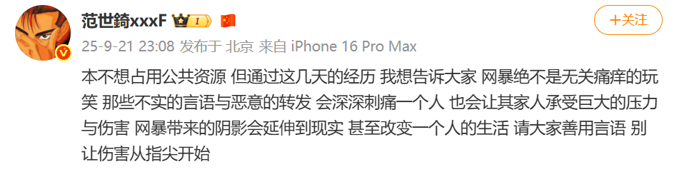 范世錡本人也发声呼吁停止网暴。