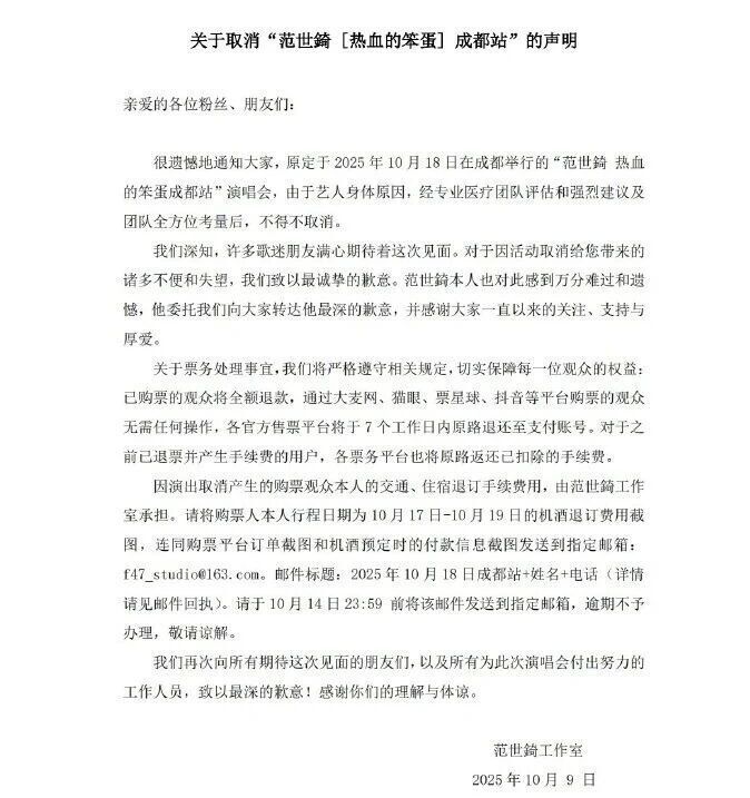 10月9日,@范世錡工作室发文:很遗憾地通知大家,原定于2025年10月18日在成都举行的“范世錡 热血的笨蛋成都站”演唱会,由于艺人身体原因,经专业医疗团队评估和强烈建议及团队全方位考量后,不得不取消。我们深知,许多歌迷朋友满心期待着这次见面。对于因活动取消给您带来的诸多不便和失望,我们致以最诚挚的歉意。范世錡本人也对此感到万分难过和遗憾,他委托我们向大家转达他最深的歉意,并感谢大家一直以来的关注、支持与厚爱。后续票务退票处理工作及交通住宿补偿事宜将陆续展开,详情请见声明。最后再次向所有期待这次见面的朋友们,以及所有为此次演唱会付出努力的工作人员,致以最深的歉意!感谢你们的理解与体谅,期待在未来更好的相见!
