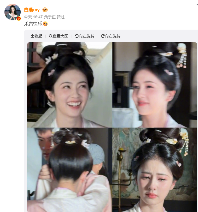 10日下午,白鹿个人社媒分享四张照片,并发文:杀青快乐。