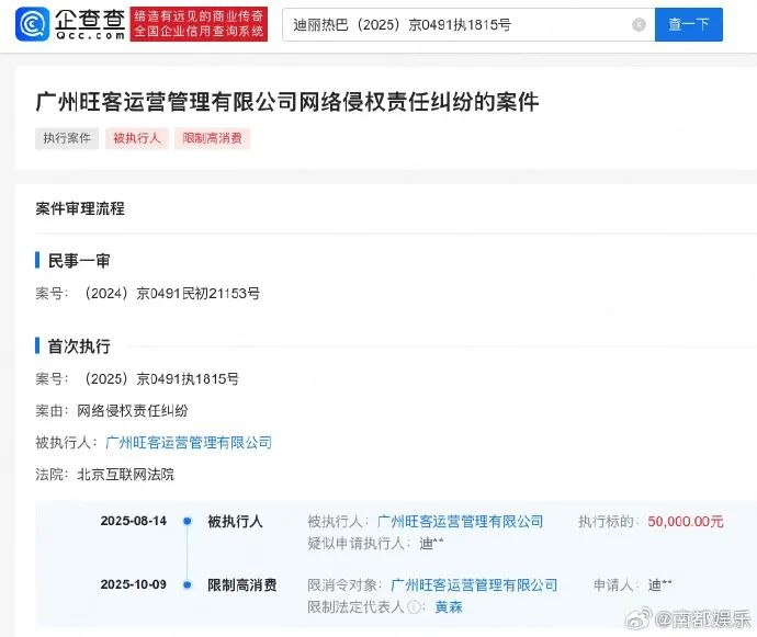 近日,迪丽热巴与广州旺客运营管理有限公司网络侵权责任纠纷新增限制消费令,8月该公司已因此案被强制执行5万元。