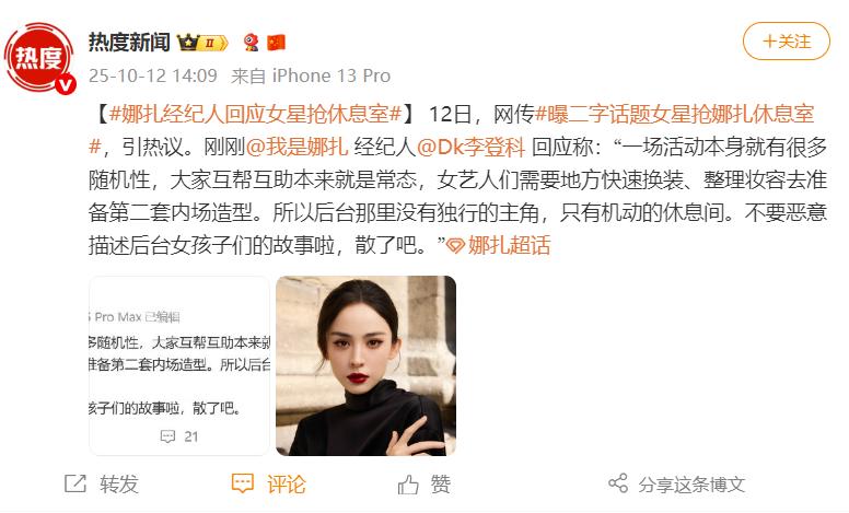 12日,网传#曝二字话题女星抢娜扎休息室#,引热议。
