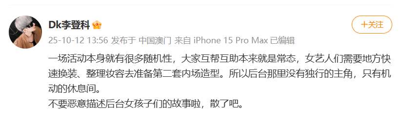 12日,网传#曝二字话题女星抢娜扎休息室#,引热议。刚刚,娜扎经纪人@Dk李登科 回应称:“一场活动本身就有很多随机性,大家互帮互助本来就是常态,女艺人们需要地方快速换装、整理妆容去准备第二套内场造型。所以后台那里没有独行的主角,只有机动的休息间。不要恶意描述后台女孩子们的故事啦,散了吧。”