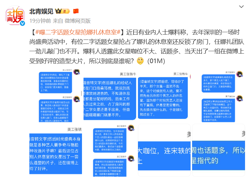 此前,有业内人士爆料称,去年深圳的一场时尚盛典活动中,有位二字话题女星抢占了娜扎的休息室还反锁了房门,任娜扎团队一劲儿敲门也不开。爆料人透露此女星咖位不大、话题多、当天出了一组在微博上受到好评的造型大片。
