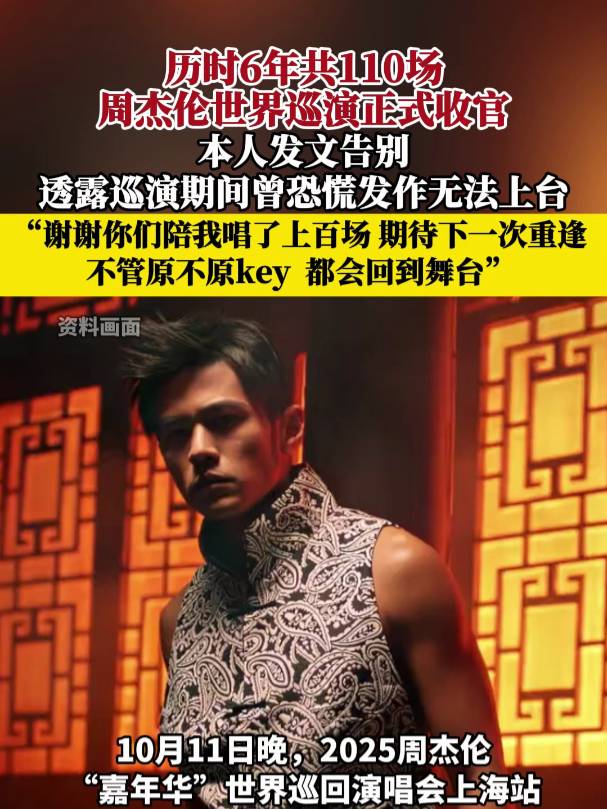10月11日晚,2025周杰伦“嘉年华”世界巡回演唱会上海站在上海体育场上演,历时6年共110场的世界巡演至此正式收官。