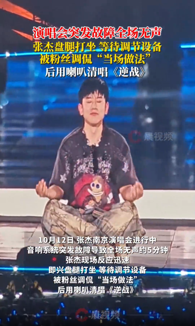 10月12日,张杰南京演唱会进行中,音响系统突发故障导致全场无声约5分钟,张杰现场反应迅速,即兴盘腿打坐,等待调节设备,被粉丝调侃“当场做法”后用喇叭清唱《逆战》。