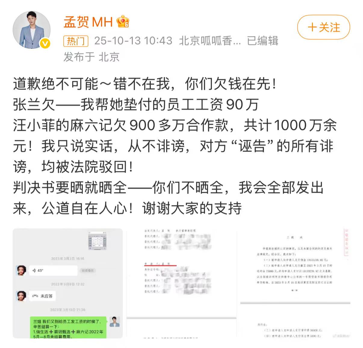 随后10月13日,孟贺再次发文并晒图表示,已向张兰母子支付15000元精神损失抚慰费,并晒出麻六记欠款相关法院判决书。