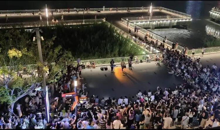 这是他在西岸梦中心的第三场演出。第一场因为下雨,人不多。但他后来把演出视频发到自己的社交平台上,到第二场就有很多人就专门赶来了。三伏天里人山人海,一片手机电筒光的海洋,制造出大型演唱会现场的氛围。网友“智智子”特意从重庆赶来,赶上了庄Paul演出的第三场。她后来发朋友圈说:“月圆之夜,听到了《红日》。”