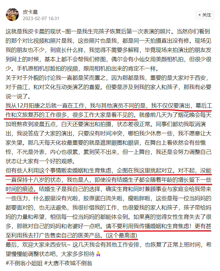冯佳晨回应称,阳康后为了工作,有时加班熬夜到凌晨五点,白天还要演出和拍摄,状态差很正常,但有些人利用这个事情,贩卖婚姻和生育焦虑,甚至被用来打广告卖医美产品。她表示,结婚和生育是自己的选择,不想被利用,来传播婚姻和生育焦虑。
