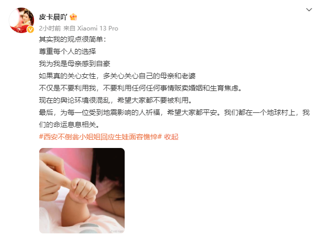 次日,冯佳晨再次发博表示:尊重每个人的选择,我为我是母亲感到自豪,如果真的关心女性,多关心关心自己的母亲和老婆。