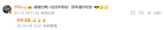 李现则在评论区回复:“谢谢白菊~拍戏辛苦啦!回来请你吃饭。”(据悉,白菊是杨紫在《生命树》中饰演的角色名。)