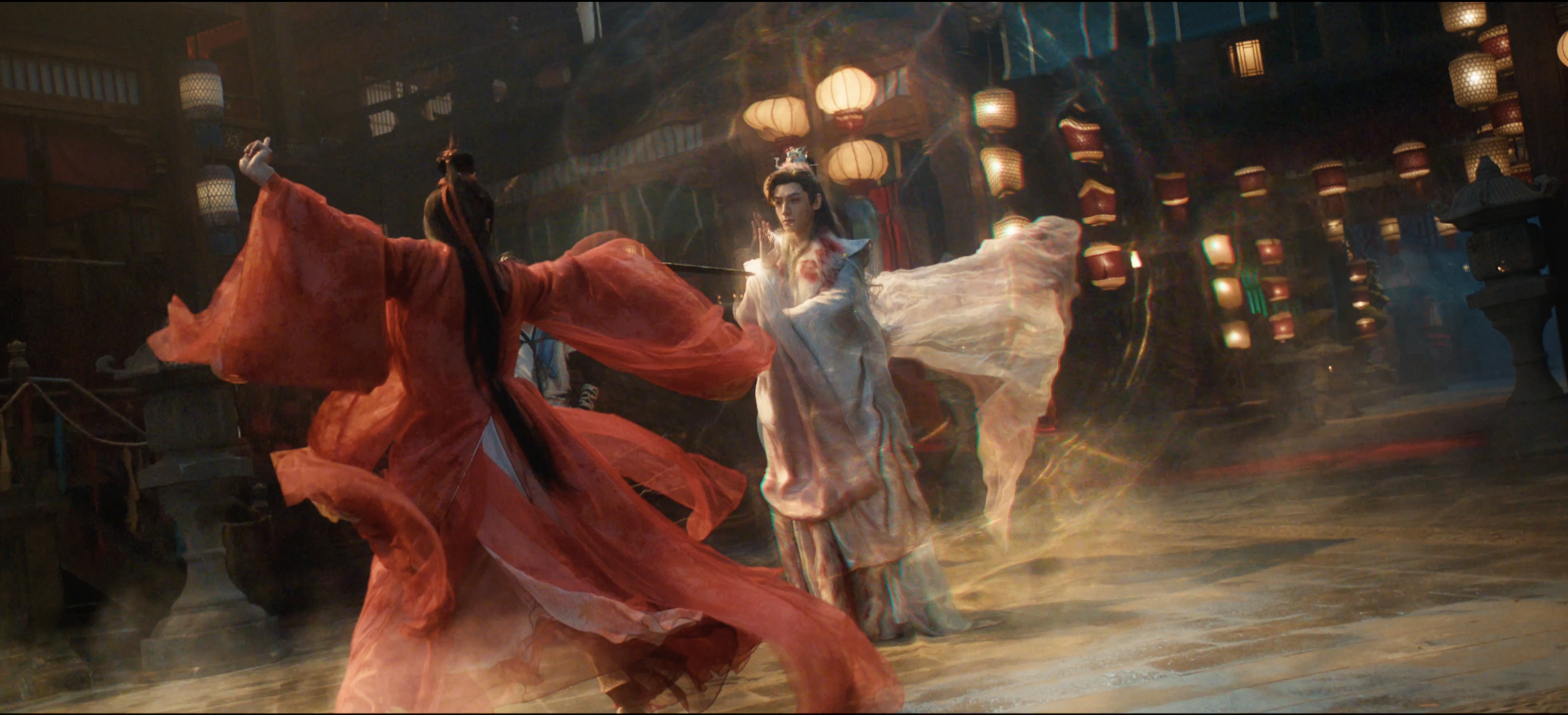 定档预告中,该剧武戏场景如一幅幅流动的东方写意长卷:唐俪辞或一袭玄衣踏月凌空,身姿如墨;或以红绸为刃,于高台楼阁间舞出一抹惊鸿;更有与柳眼在桃花纷飞间、蒹葭摇曳处的往来过招……每一帧画面皆将侠者之“势”与东方之“韵”融为一体,既见招式的凌厉写实,亦含意境的空灵留白,营造出兼具视觉震撼与美学沉淀的东方盛宴。