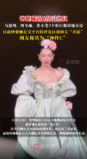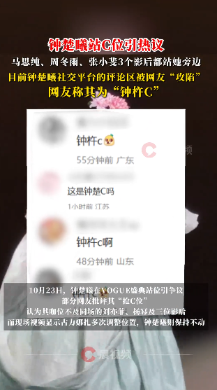 10月23日,钟楚曦在VOGUE盛典站位引争议,部分网友批评其“抢C位”,认为其咖位不及同场的刘亦菲、杨幂及三位影后(周冬雨、马思纯、张小斐),而现场视频显示古力娜扎多次调整位置,钟楚曦则保持不动。