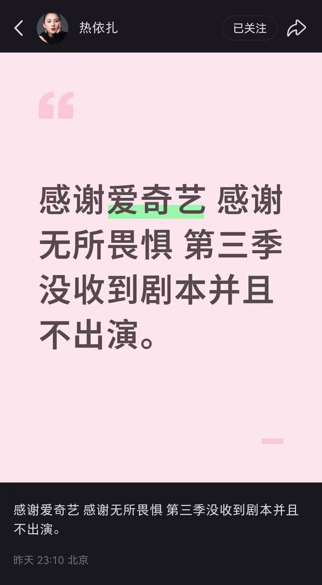 10月27日晚,演员热依扎在小红书发文确认将不再参与电视剧《无所畏惧》第三季的拍摄,她明确表示:“感谢无所畏惧,第三季没收到剧本并且不出演。”