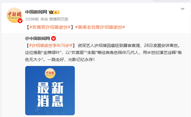 据中国新闻网消息,许绍雄因癌症致器官衰竭,于10月28日凌晨离世,享年76岁。