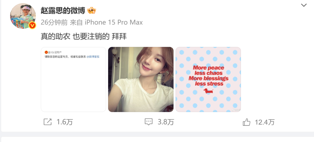 8月13日晚,赵露思发微博表示真的是助农,并表示将注销微博。