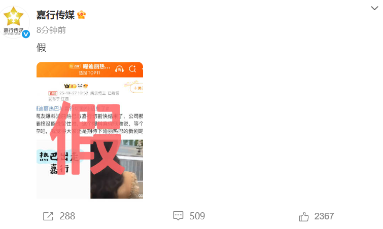 此前,10月27日,针对迪丽热巴和经纪公司切割快结束的话题,嘉行传媒发文打假。嘉行传媒官博晒出相关内容打上红色“假”字辟谣。