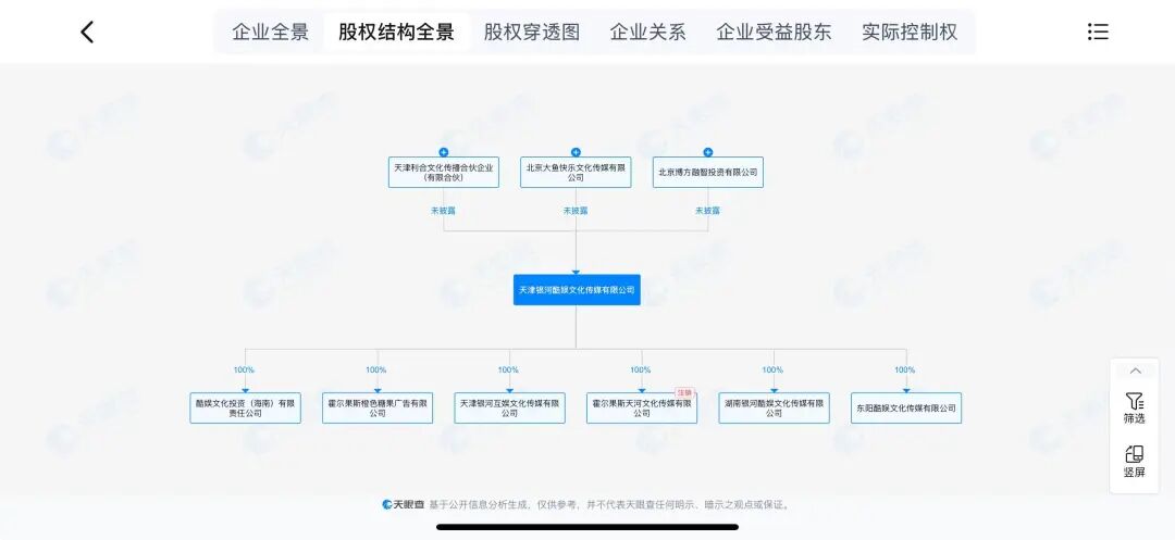 天眼查APP显示,天津银河酷娱文化传媒有限公司成立于2015年,法定代表人为吴晓珍,注册资本3760多万元;此前公司股东共有8家,目前还有三家股东,但持股比例未披露。