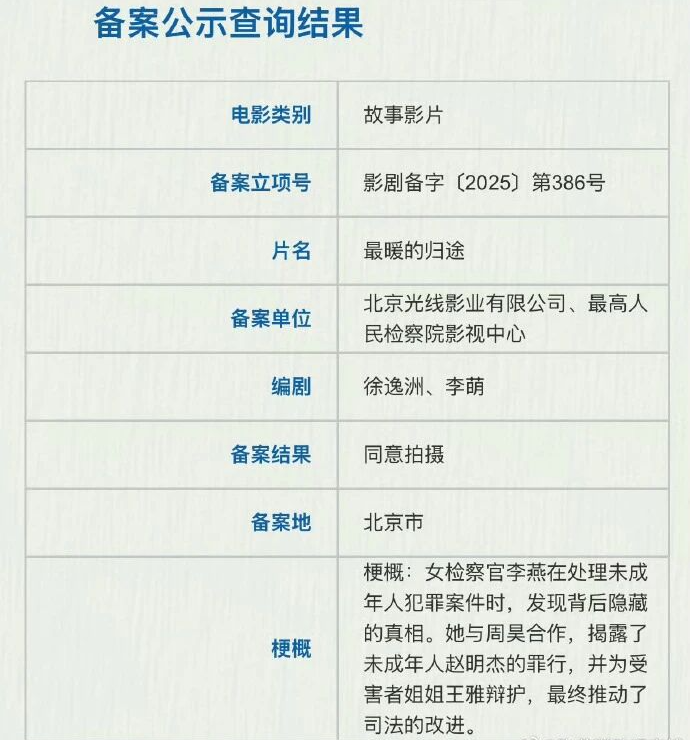 网传备案信息显示,《第十七条》备案名为《最暖的归途》,由北京光线影业有限公司、最高人民检察院影视中心备案,暂未官宣演员阵容。