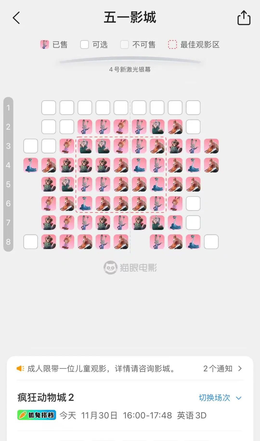 济南一影院经理李言鲁对记者说:“在这个时间段,《疯狂动物城2》没有对手。一些影厅数量较少的影院,全天只排这一部片子。如果不提前买票,这个周末只能看《疯狂动物城2》黄金场次的角落座位了。”