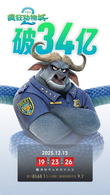 据猫眼专业版数据,截至12月13日19时23分,电影《疯狂动物城2》上映18天,总票房破34亿。