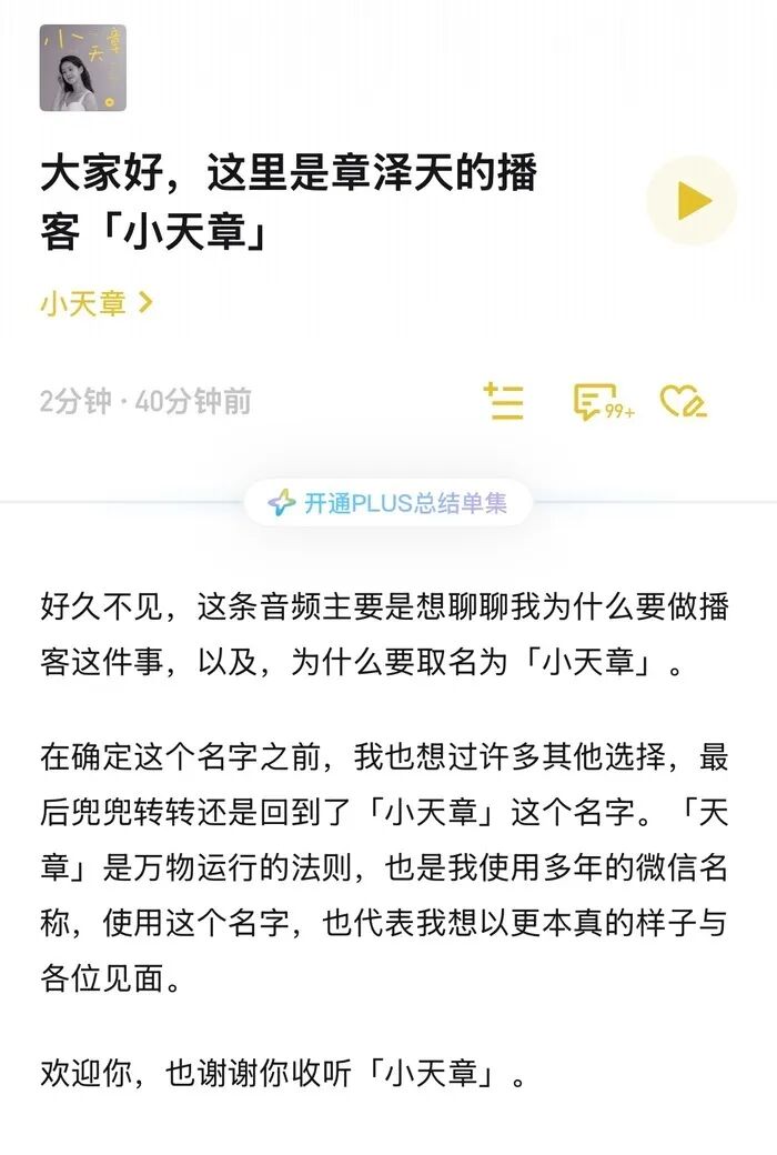 1月12日,章泽天个人播客开通,取名为“小天章”,首条播客shownotes中,章泽天谈到“天章”是万物运行的法则,也是其使用多年的微信名称,使用这个名字,也代表其想以更本真的样子与各位见面。