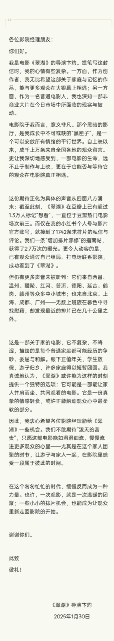 1月30日,青年导演卞灼发布一封致全国影院经理的公开信,以恳切质朴的文字,讲述了其执导的小成本影片《翠湖》上映后的处境与期盼,引发关注。信中,卞灼直言自己心情复杂,既欣慰于影片收获的观众喜爱,也无奈于其排片惨淡的现实。他透露,影片官方账号与自己的社媒账号上,已累计收到1742条求排片的私信与评论,一条“增加排片攻略”帖更获得2.7万次曝光。