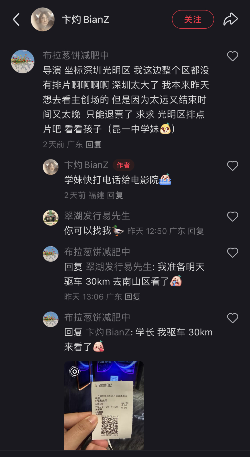 导演卞灼个人社媒的留言区里,观众在求排片。
