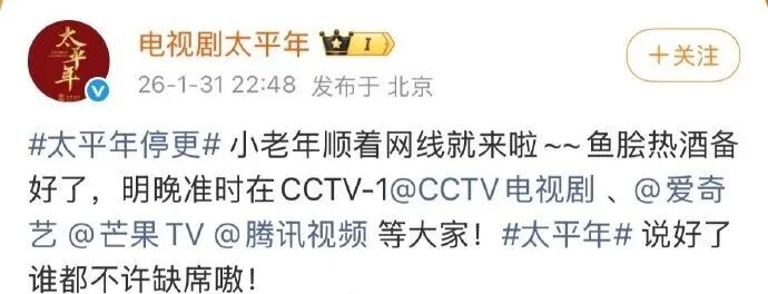 1月31日晚,#太平年停更# 登上微博热搜,随后 @电视剧太平年 发博回应:小老年顺着网线就来啦~~鱼脍热酒备好了,2月1日晚准时等着大家,说好了都不许缺席嗷。