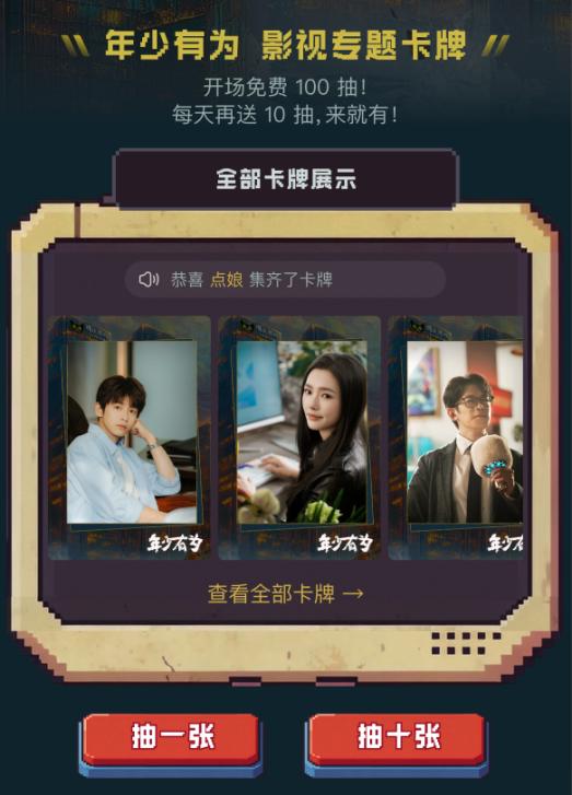 目前,起点读书App已同步上线多款联动玩法,通过“追剧情”等模块,实现剧集与原著章节一键同步,帮助观众无缝切换至深度阅读。同时,秉持原著精神,起点还上线了《年少有为》影视专题卡牌活动,用户不仅可获100次免费抽卡机会,每日还可额外领取10次——不肝不氪,就可以享受“欧皇”的乐趣。