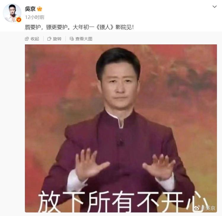2月6日晚,吴京发布一张自己的表情包幽默回应“唇部紧急护理”登上热搜一事,并顺势宣传了即将上映的新片《镖人》:“唇要护,镖更要护。”