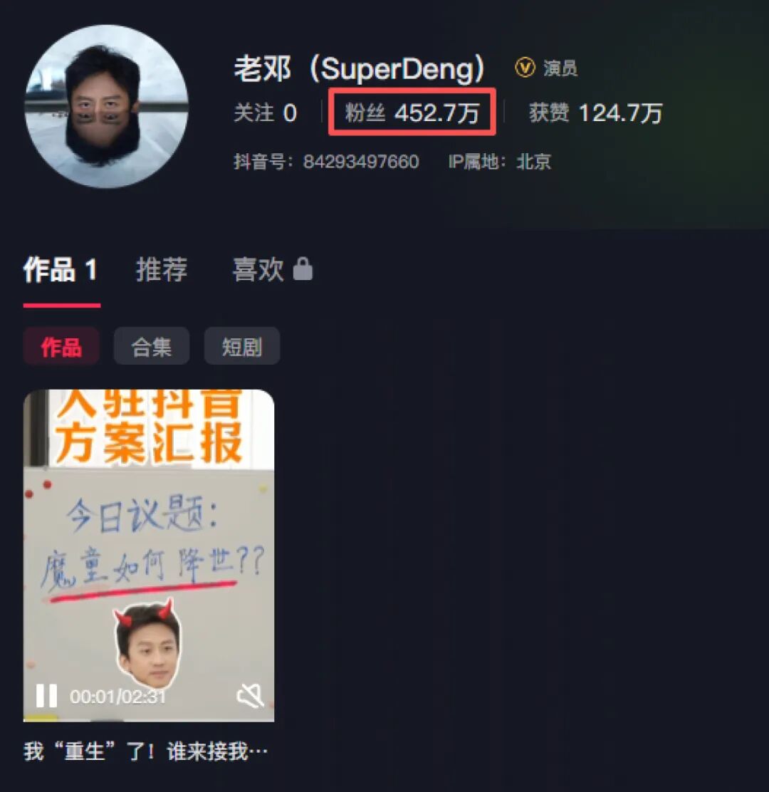 2月6日,演员邓超正式宣布入驻抖音,一条视频没发粉丝就超过400万,大家都戏称他为“魔童降世”。2月8日,邓超更新第一条视频,一小时内点赞超70万,截至发稿,点赞量已突破百万。该视频主题为讨论“魔童如何降世”,邓超向团队提出需求:想做欢乐搞笑的,想去那些看不见的地方,想尝试这个世界上没有的。