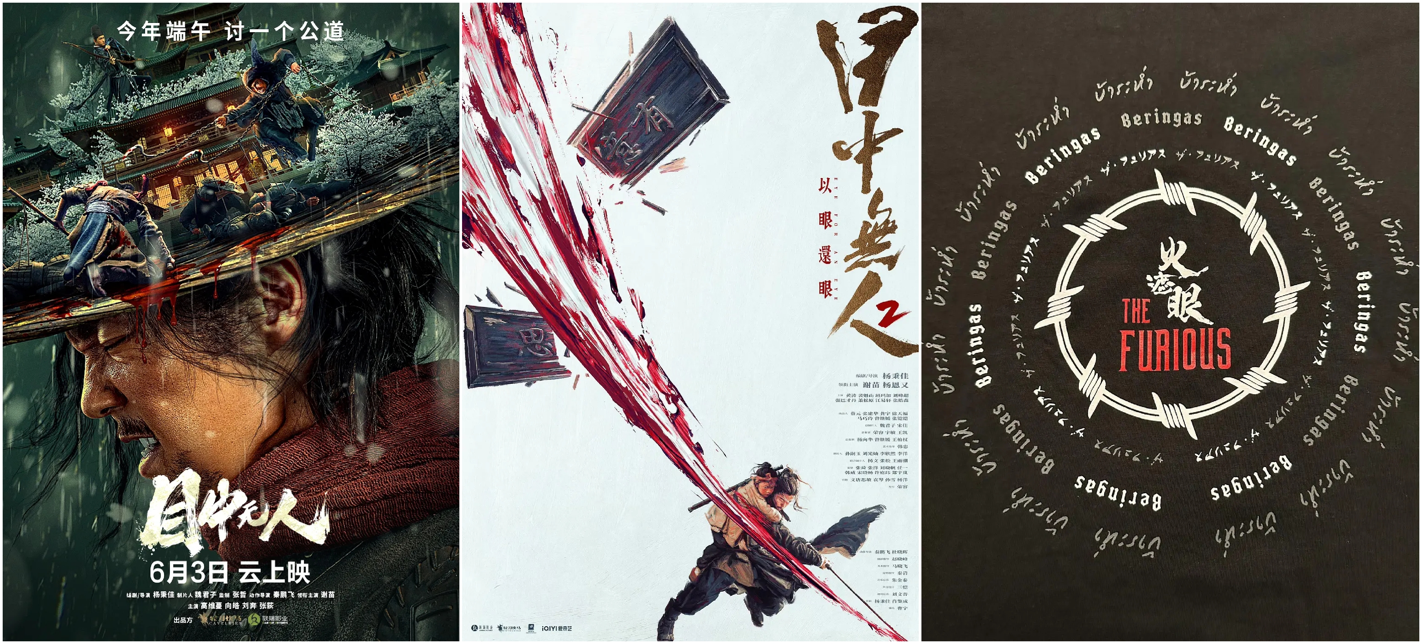 但是在小荧屏上看电影,终归还是让人觉得是一种文化消费的降级。这个问题直到《目中无人》也没能解决,就是故事设计和服化道的土味。一杯浊酒除恶霸,“捉刀人”的身份设定,显然已经意识到,动作男星少说话的重要性。嘴巴实在闲不住,就让武术指导设计到动作里去,譬如喷一口酒,杀出一团“火影忍者”风。