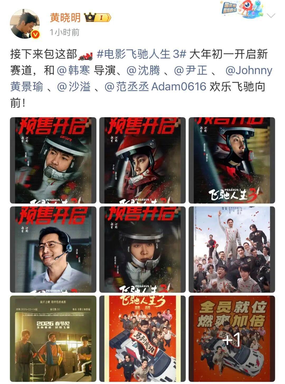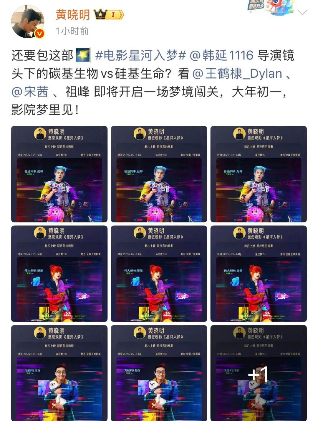 2月14日,2026春节档即将开启,著名演员黄晓明在微博连发5条微博,为网友送上50场春节档观影票。