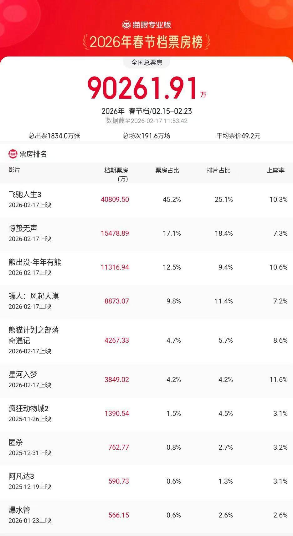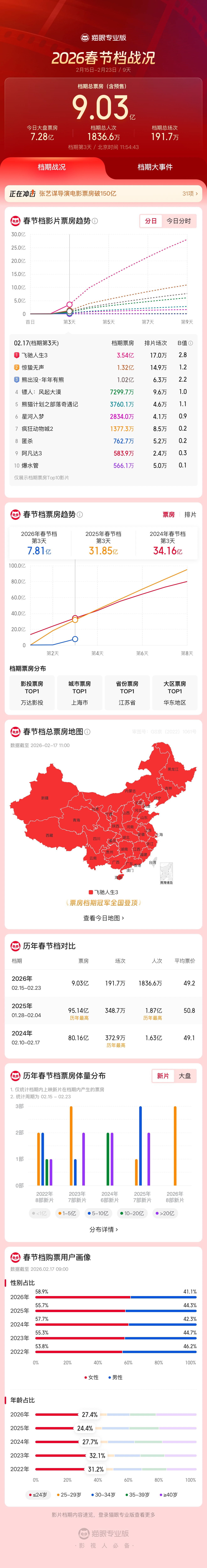 据猫眼专业版数据,2026年春节档档期总票房破9亿,《飞驰人生3》持续领跑。