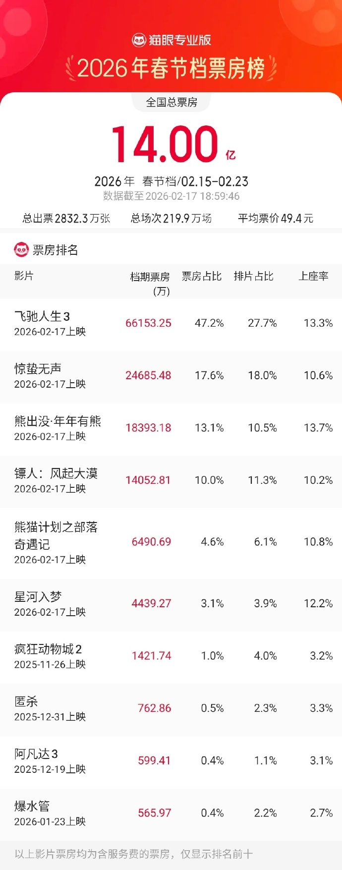 据猫眼专业版数据,2026年春节档档期总票房(含预售)破14亿,《飞驰人生3》《惊蛰无声》《熊出没·年年有熊》分列前三位。