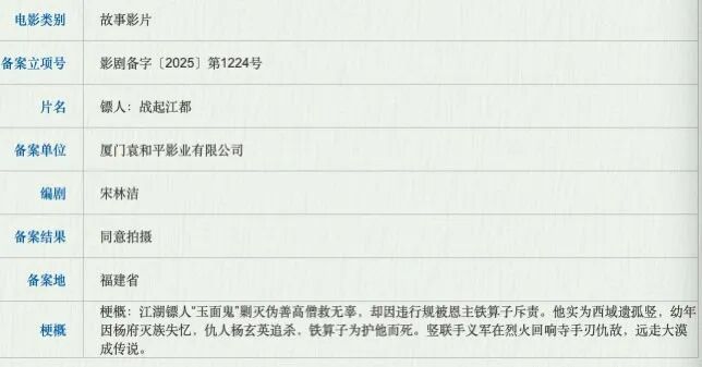 极目新闻记者在国家电影局官网搜索发现,早在去年7月,同样由“厦门袁和平影业”出品的《镖人:战起江都》就已经备案公示。