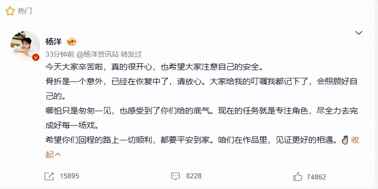 2月22日,演员杨洋在社交平台发文,回应手部骨折: