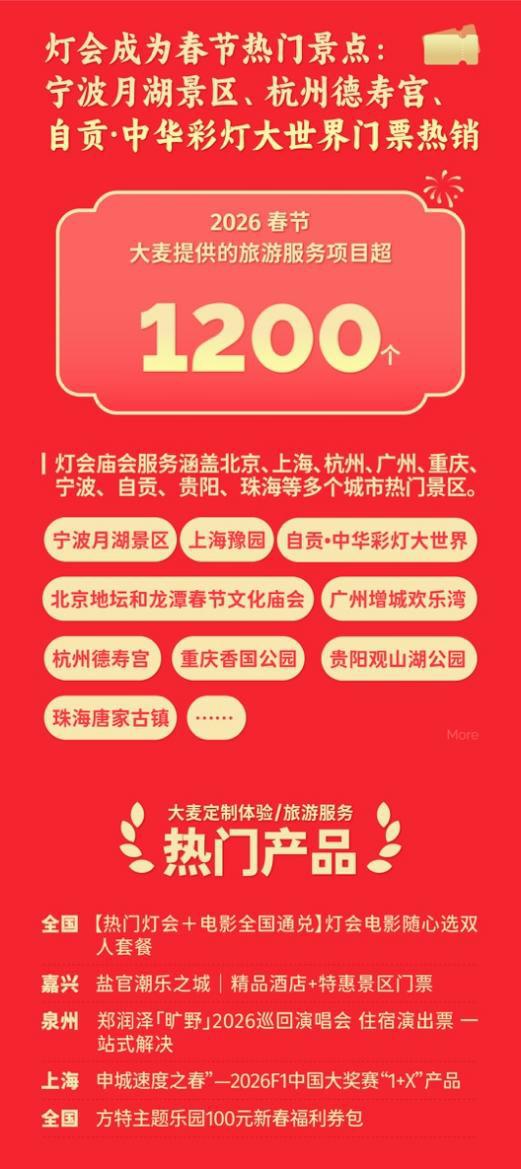 今年春节,大麦提供的旅游服务项目超1200个,民俗活动、灯会庙会合作项目超100个。其中,灯会庙会服务涵盖宁波月湖景区、上海豫园、自贡·中华彩灯大世界、北京地坛和龙潭春节文化庙会、广州增城欢乐湾、杭州德寿宫、重庆香国公园、贵阳观山湖公园、珠海唐家古镇等多个城市热门景区。