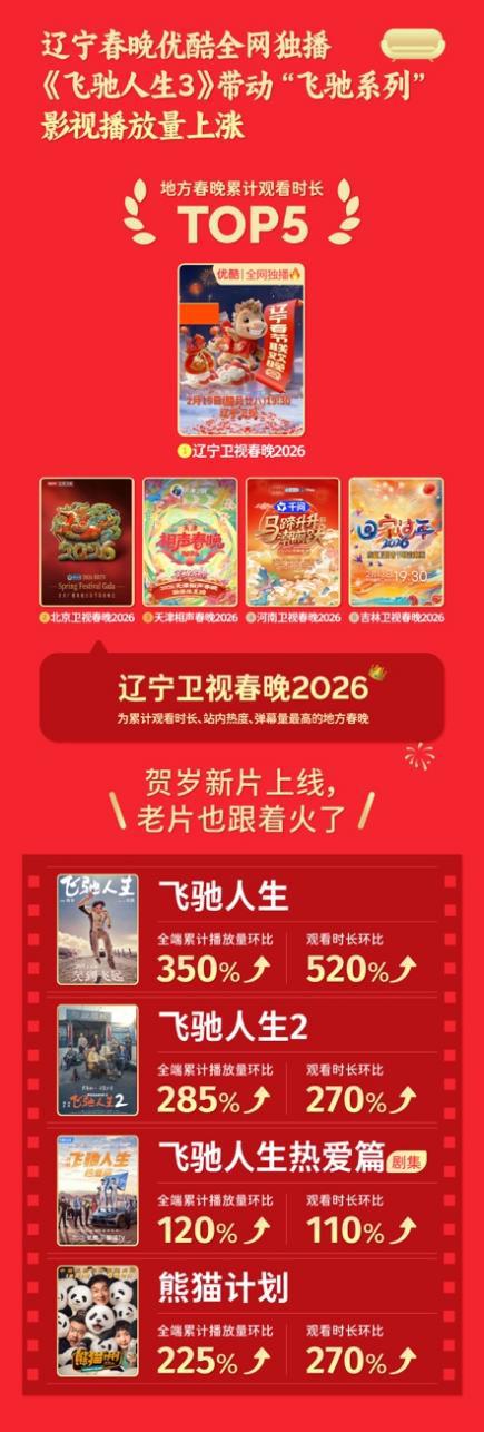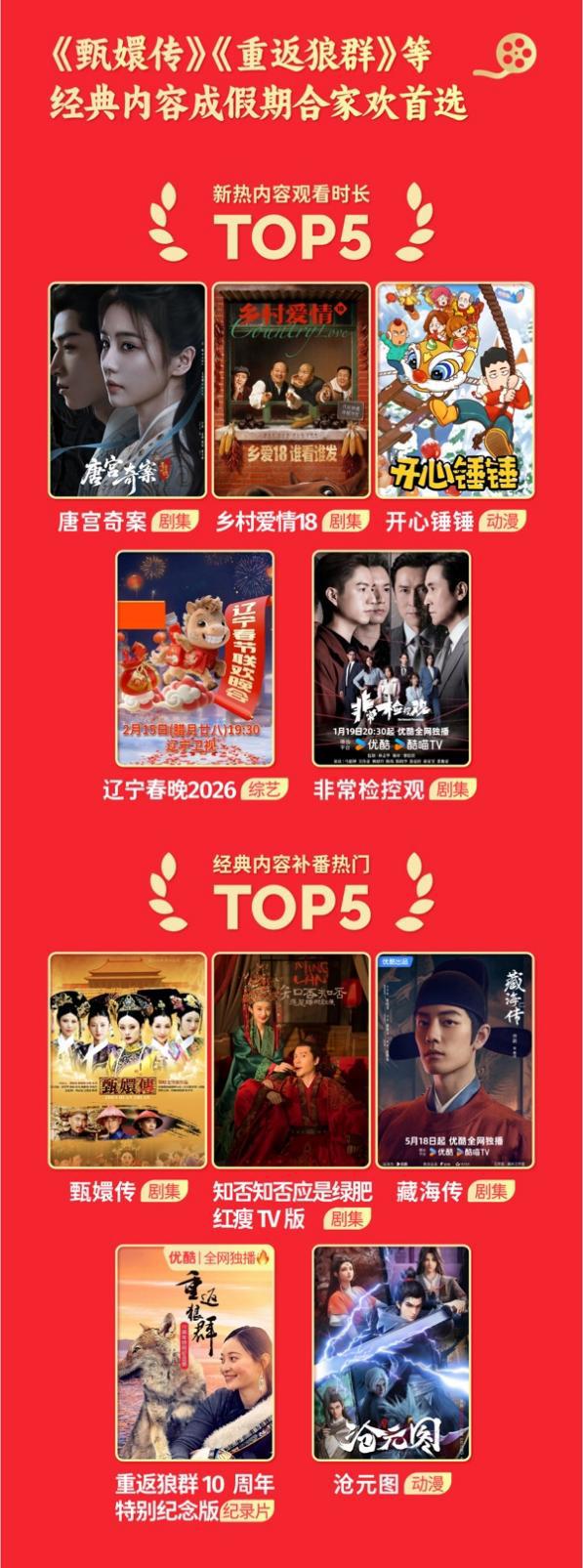 线上方面,经典影视内容在春节期间再次被激活。春节档电影《飞驰人生3》带动站内同名IP系列电影、剧集如《飞驰人生热爱篇》等观看量显著回升,经典内容如《甄嬛传》《重返狼群 10周年特别纪念版》也迎来补番热潮。优酷全网独播的《2026辽宁春晚》在地方春晚中累计观看时长、站内热度及弹幕量均排名第一。