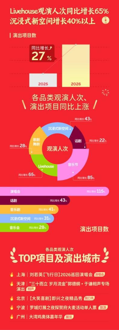 2026年春节期间,大麦平台演出项目数同比增长27%。其中,Livehouse观演人次同比增长65%,沉浸式新空间等新兴形态观演人次同比增长超40%。
