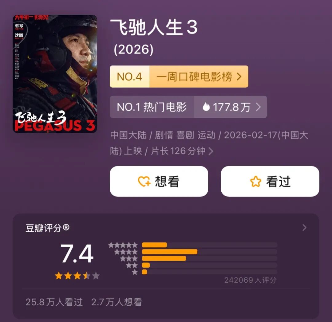 3、《飞驰人生3》7.4分