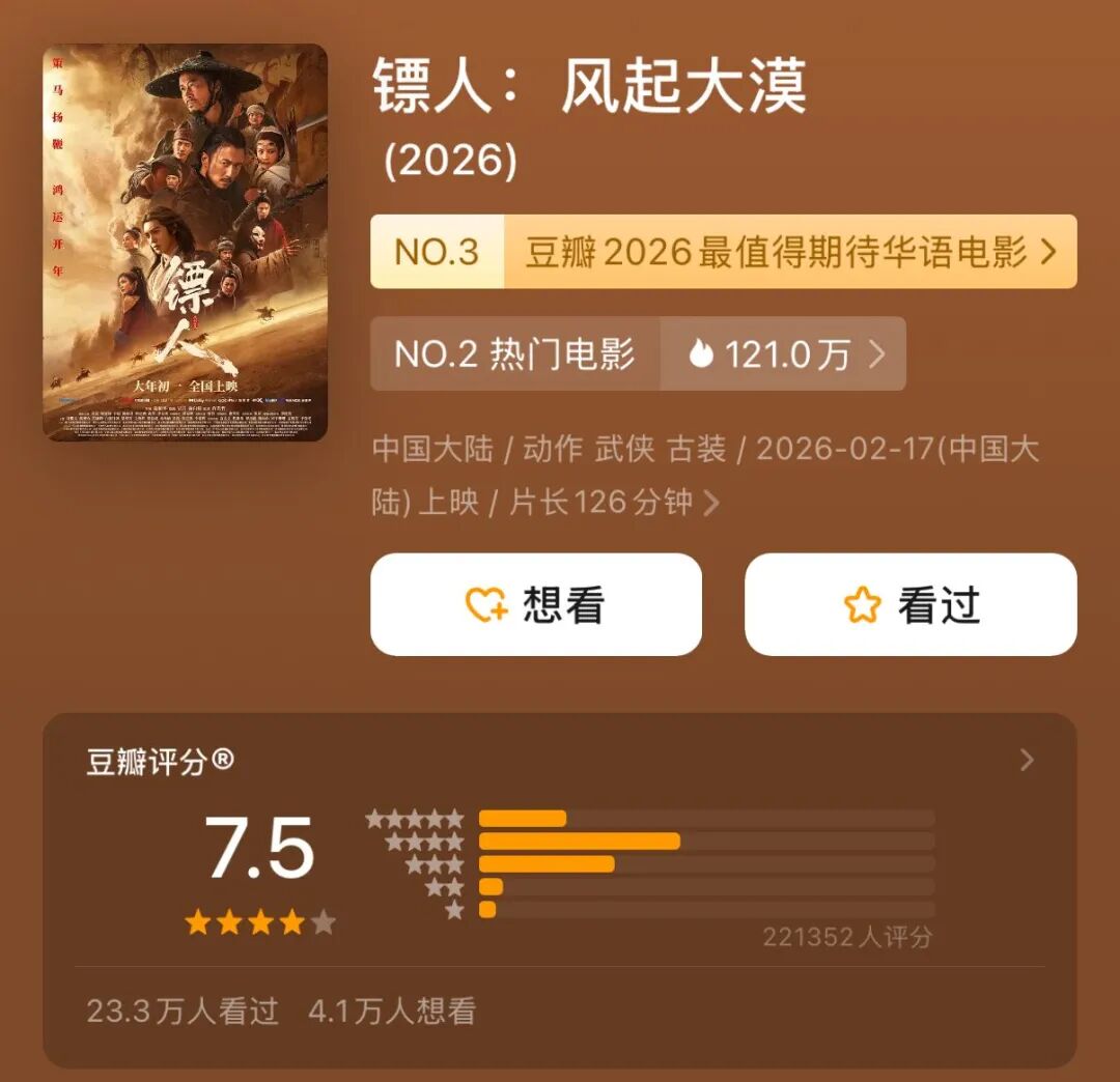 2月21日大年初五,春节档豆瓣评分发生变化,《飞驰人生3》从开分时的7.6分调整至7.4分,《镖人》则保持在7.5分,跃升为春节档新片口碑第一。