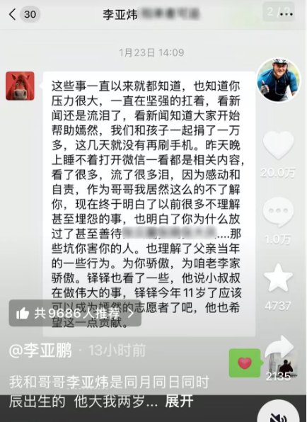 李亚炜给李亚鹏发出的微信时间是1月23日,李亚炜称这些事一直以来他都知道,也知道李亚鹏的压力很大,所以在看到相关新闻时,他忍不住流泪,并和孩子一起捐了一万多元。“昨天晚上睡不着,打开微信一看都是相关内容,看了很多,流了很多泪,因为感动和自责,作为哥哥我居然这么的不了解你,现在终于明白了以前很多不理解甚至埋怨的事……为你骄傲,为咱老李家骄傲。”