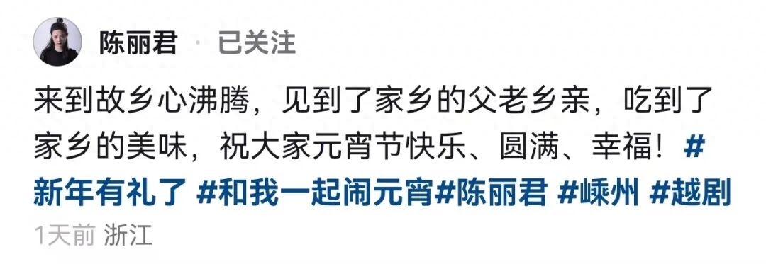 3月3日,浙江越剧演员陈丽君在个人社交平台晒出一段回绍兴嵊州老家的视频,并配文:“来到故乡心沸腾,见到了家乡的父老乡亲,吃到了家乡的美味。”