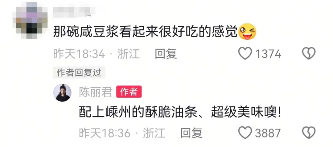 有网友表示,“那碗咸豆浆看起来很好吃。”陈丽君立马回复:“配上酥脆油条,超级美味!”