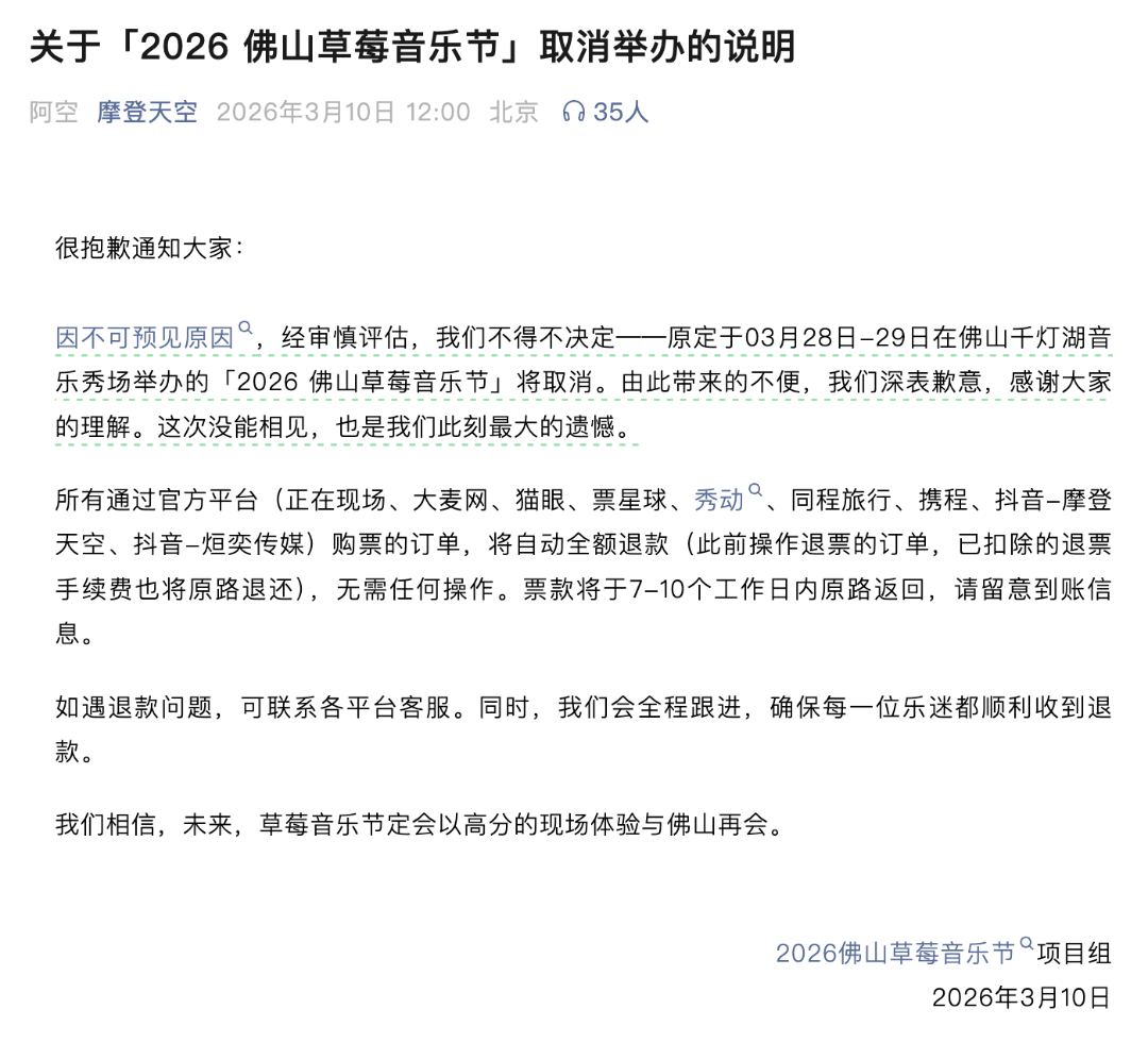 公告称原定于3月28日—29日在佛山千灯湖音乐秀场举办的“2026佛山草莓音乐节”将取消。所有通过官方平台购票的订单,将自动全额退款。票款将于7—10个工作日内原路返回。