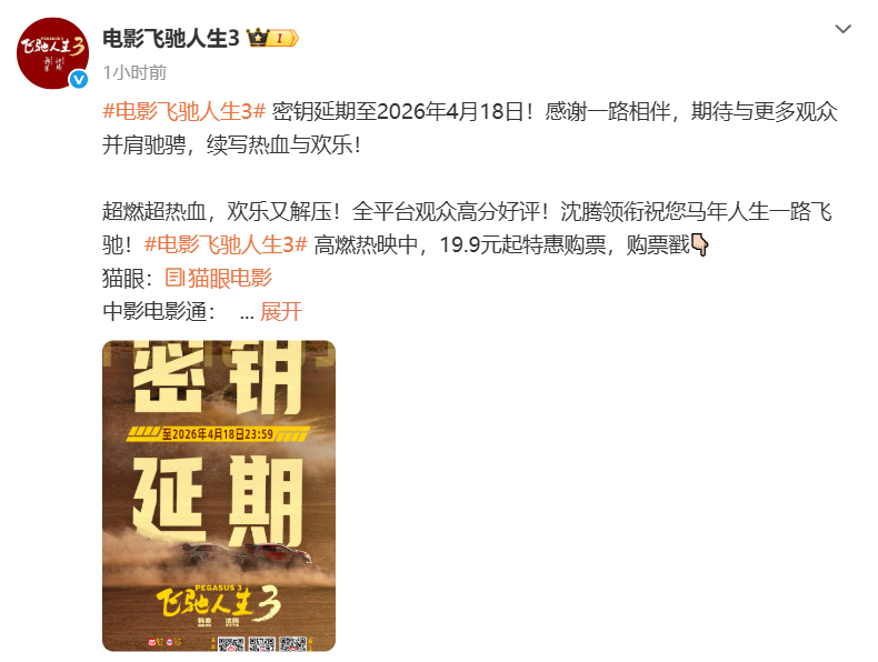 3月11日,《飞驰人生3》官宣密钥延期,延长上映至2026年4月18日,据猫眼专业版数据,截至当前累计票房已超41.38亿。